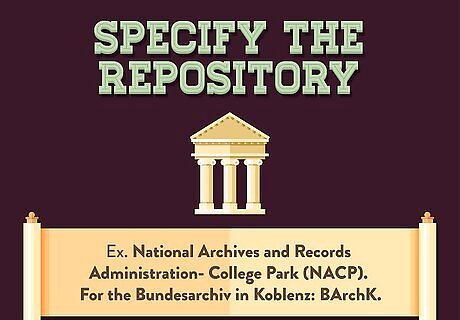 Specify the repository. You will need to give the specific repository, which is the location that holds the archival material, in your citation. This shows your readers where they can find the material, and can help you relocate the material if need be. Many national archives have multiple repositories, and you will need to also designated this information. For example, the National Archives of the United States and the German Federal Archives have several locations across each country. In these cases, you would note: National Archives and Records Administration- College Park (NACP). For the Bundesarchiv in Koblenz: BArchK.