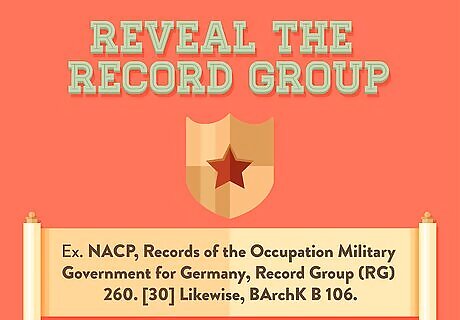 Reveal the record group. Most archives are organized into distinct record groups by subject. The overarching record group is the most important pointer to you and your readers about where to find the specific document(s) you cite. Include the record group, even if you don’t note any other information. This information gives credence to your citation. If you are working at a smaller repository without record groups, provide the best information that you are able. For example: NACP, Records of the Occupation Military Government for Germany, Record Group (RG) 260. Likewise, BArchK B 106.