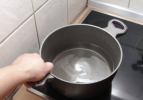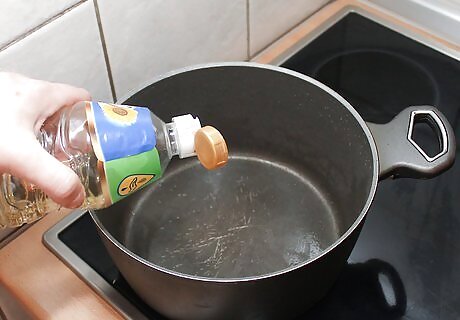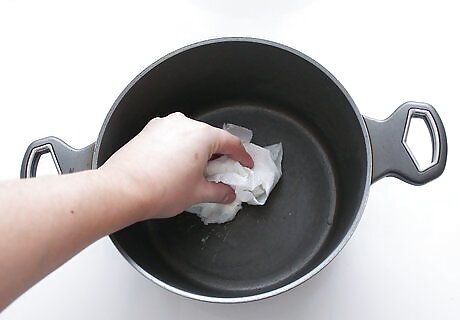 Coat the pot with oil, then heat it on the stove for 5 minutes. Place your dutch oven on a burner set to medium-low. When it’s hot, add enough vegetable or flaxseed oil to thickly coat the bottom. Keep the pot on the hot burner for 5 minutes, or until the oil smokes, then turn off the stove.