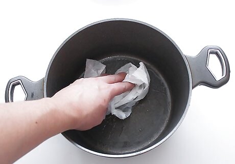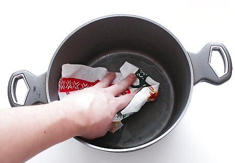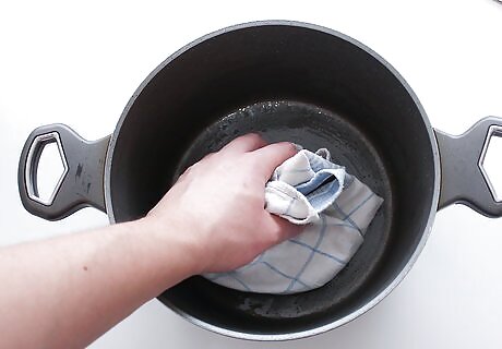 Rinse and dry the pot, then coat it thinly with oil. After scrubbing the pot, rinse it thoroughly under hot water, then dry it completely with paper towels or your cast iron cloth. Heat the pot on a burner set to medium-low to evaporate the last bit of water. Turn the burner off, add a teaspoon of oil to the pot, then use paper towels to spread the oil and absorb any excess.
