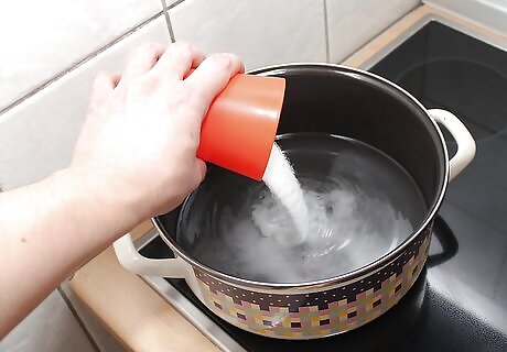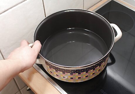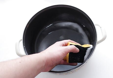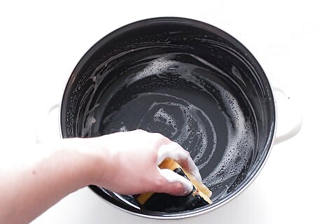Boil water in the pot before washing if it’s a little grimy. Boiling water is a quick trick for stubborn bits of grime, but not so tough that they require breaking out the big guns. Fill the pot halfway with water, place it on a burner set to medium, and let the water boil briskly for a few minutes. Scrape away the residue with a wooden spatula, pour out the water, then wash the pot with soap and hot water. If stubborn stains didn’t flake away after the quick boiling water technique, you can try more intensive cleaning methods.