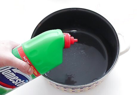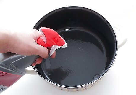 Try ammonia if you have it on hand. If you happen to have ammonia for household cleaning, you can use that instead of running to the store for a commercial degreaser. Dilute 2 to 3 tablespoons (29.6 to 44.4 ml) of household cleaning ammonia with hot water at a 1 to 1 ratio. Scrub the problem spots, then rinse the pot thoroughly with hot water. Ammonia is an excellent degreaser, but it’s harsh, toxic, and not eco-friendly. Wear gloves and work in a well-ventilated area. Never mix ammonia and bleach together, as they produce toxic fumes when combined.