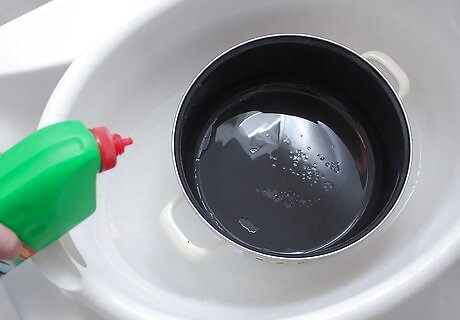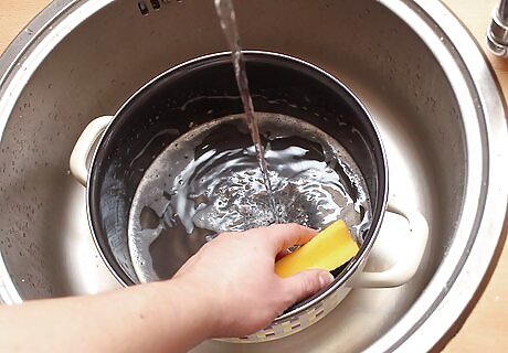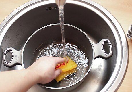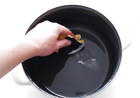 Wash the pot with dish soap, hot water, and a soft scrub pad. You’ll have an easier time cleaning your dutch oven when it’s still hot, so wash it as soon after cooking as possible. Run hot water, add a few drops of dish soap, and scrub off food residue with your non-scratch pad. Rinse away soap suds, then dry the pot thoroughly with a towel.