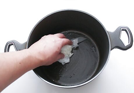 Add coarse salt to form a thin paste, then scrub the pot. Make a liquidy paste with the salt and oil, then put on a pair of clean work gloves. Scrub the inside of the dutch oven completely with a wad of paper towels. Use a potholder to hold the handle and steady your dutch oven as you scrub.
