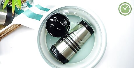 Soak the mug, lid, and rubber seal in the soapy water for 10 minutes. Once the sink or bowl is filled with soapy water, place the mug, lid, and rubber seal into the water. Make sure everything is submerged. Then, leave them to soak for 10 minutes. Giving them time to soak will help soften and loosen any residue or germs.