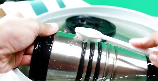 Scrub the mug parts with a bottle brush or clean toothbrush. First, dip the bottle brush or toothbrush into the soapy water to wet the bristles with the dish soap solution. Then, scrub all over the mug, lid, and rubber seal, making sure that you spend a bit of extra time scrubbing the crevices of the lid. This will remove residue, grim, or bacteria still stuck to any of the mug pieces. Make sure that the toothbrush or bottle brush is clean and sanitized before using it to scrub your travel mug.