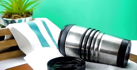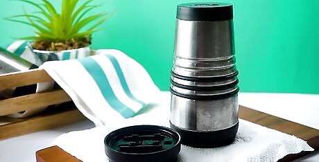 Let your travel mug air dry completely before using it. Once rinsed, place the mug and lid on a clean paper towel. Let the lid and mug air dry separately to avoid trapping any moisture inside, which could allow bacteria to start to grow. If possible, sanitize your travel mug after every use, or at least every other use.