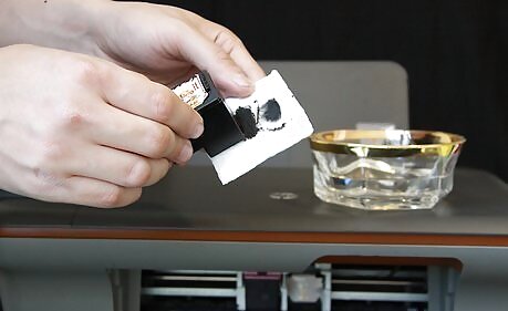 With your other hand, gently "Blot" the cartridge by pressing the printhead into the towel a few times. (The printhead is the bottom of the cartridge where the ink is jetted onto your paper). This will help to remove dried ink on the surface of the printhead. A good "Blot" should show a uniform, solid ink pattern (from each chamber) on towel.