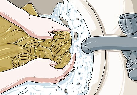 Hand wash drapes when necessary. Wool, cotton, and sheer fabrics like lace usually require hand washing. Never put hand wash only drapes in a washing machine, as this can cause damage. To hand wash drapes, fill a sink with cold water and add one teaspoon of liquid dish detergent. Place one panel at a time in the water. Allow the panels to soak for 10 minutes before removing them. Then, swirl the drapes to remove the debris. Drain the sink and refill it with clean water. Repeat the process to dry your drapes. Make sure to swirl your drapes until all soap residue is removed. If necessary, repeat the rinsing process twice.