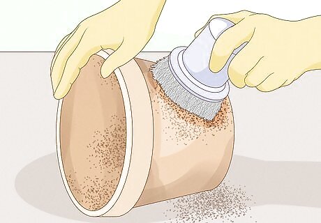 Remove the debris with the stiff brush. Scrubbing off the debris removes as much loose dirt as possible from the pot. Removing this superficial dirt will accelerate the soaking process.