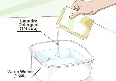 Make your cleaner. Mild laundry detergent and dish soap are safe to use on resin furniture. Fill a gallon size bucket with warm water. Then, mix in a quarter cup of either mild laundry detergent or dish soap. You can also spray the furniture with an appropriate commercial cleaner, such as a mildew remover if there’s mold or mildew, or an adhesive remover if there’s sap. Be sure to rinse away the cleaner immediately after to avoid damaging your furniture.