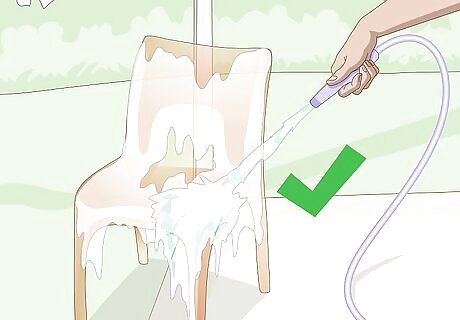 Rinse your furniture. You rinse your furniture the same way you initially soaked it. Use a hose or bucket to spray down the furniture. Keep spraying the furniture, or dumping buckets of water on it, until the water runs clean. Soap residue can damage your furniture. Don’t let the water pool on the furniture or sit for too long as this may damage your furniture.