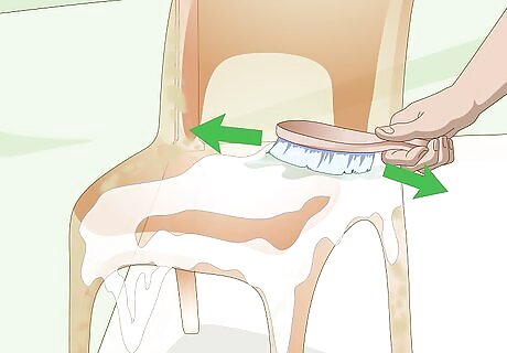 Scrub down your furniture. Use a soft bristle brush to clean resin furniture. Gently scrub the furniture down with the brush until you dislodge or remove any unwanted dirt or debris. Make sure to get the cracks between the weaves on your furniture. There are many nooks and crannies that need cleaning when it comes to resin furniture.