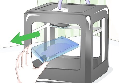 Remove the platform and tank. In order to clean resin from a 3D printer, you will first have to remove the resin tank and platform. To do so, remove the platform first to avoid getting resin on it. Then, gently slide the resin tray out of place by holding it by the front tabs, sides, or rims. Avoid touching the glass as you do not want to stain it with fingerprints. Some resin trays may be held in place with tabs, so consult your user's manual for precise instructions for your machine.