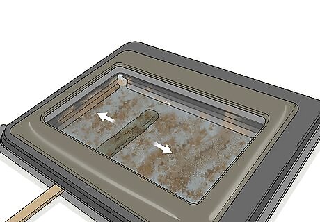 Slide the wire and cleaning wipe through the slots and scrub. By moving the cleaning wipe from side to side and bending the wire as necessary, you can clean the glass. To make sure you clean all of the glass, move the wire up through each of the slots in the bottom of the oven door to clean that area.