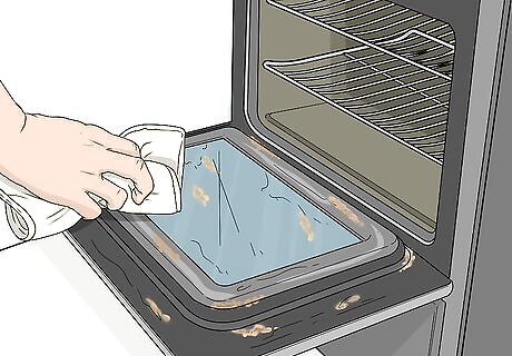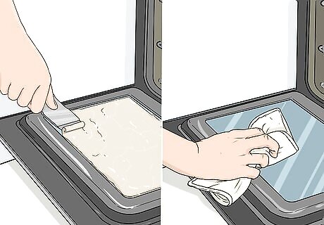 Rinse and dry the oven door. Soak the cloth in clean water and reattach it to the yardstick. Use the cloth to remove all the soap residue, then replace it with a paper towel. Reinsert the wrapped yardstick inside the door and soak up the remaining moisture. Let the door air dry for 1 hour.