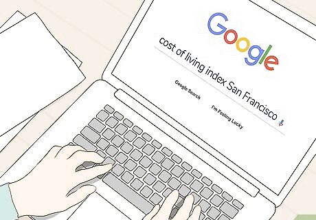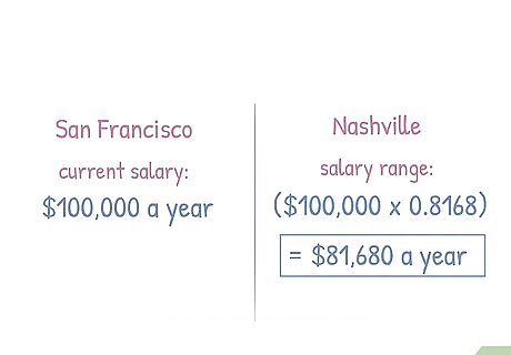 Look up the median wage for your occupation in each region. Government websites provide data on wages for different occupations in different locations. You can typically find this at the national level, but you might also look at state or local government statistics. Search for the name of the city and "labor" or "employment" to get the website for the department of labor in that area. From there, you can look up wage statistics. For example, if you're a nurse practitioner, you might note that the median wage for nurse practitioners in California is $118,000, but only $87,900 in Oklahoma. This difference may be attributable to the cost of living, but it also might be attributable to demand.Tip: In the US, you can check the website of the US Bureau of Labor Statistics. The Occupational Employment Statistics Survey, available at https://www.bls.gov/oes/, has employment and wage data for more than 800 occupations.