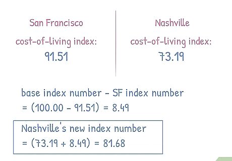 Adjust the cost-of-living indexes to compare the two cities. When you're comparing the cost of living between two cities, adjust the value of the base city to equal 100.00. Then adjust the value of the base city by the same amount. This allows you to compare the two. For example, suppose you're contemplating moving from San Francisco, CA, to Nashville, TN. San Francisco has a cost-of-living index of 91.51, while Nashville has a cost-of-living index of 73.19. In this particular index, New York City is used as the base city with a cost-of-living index of 100.00. To adjust the rates of the cities, subtract San Francisco's index number from 100.00 to get 8.49. Then add 8.49 to Nashville's index number (since you would have to add 8.49 to 91.51 to get 100.00). Nashville's new index number is 81.68 in comparison to San Francisco. This tells you that the cost of living in Nashville is 81.68% that of San Francisco's. If you were moving to a more expensive city, on the other hand, the percentage would be higher than 100%. For example, if you wanted to move from San Francisco to New York City, you would add 8.49 to New York's index number. Since New York City is the base city in this index, with a value of 100.00, New York's new index number would be 108.49. This tells you that New York is 108.49% more expensive than San Francisco, according to this particular index.