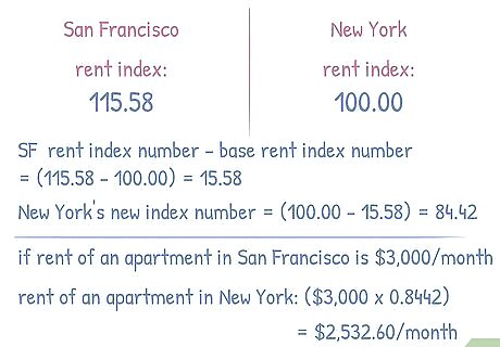 Figure the cost of renting or buying a home into your comparison. While the cost of living gives you a decent idea of how to compare salaries between cities, it doesn't give you the complete picture. In many places, the price of real estate exceeds other cost-of-living categories. This frequently happens in rapidly growing cities where the availability of real estate can't keep pace with demand. For example, suppose you're moving from San Francisco to New York City. You've already determined that the cost of living is 108.49% higher in New York City than it is in San Francisco. However, when you look at a rent index, you see that New York City is listed as 100.00 and San Francisco is listed as 115.58. Since you want your current city to be 100.00, subtract 15.58 from the San Francisco rent index number. Then, subtract the same amount from New York City's index number to get 84.42. This tells you that if you're renting an apartment in San Francisco for $3,000 a month, you would need to spend $2,532.60 a month in New York City to rent a similar apartment.Tip: Keep in mind index numbers are abstract and don't account for things such as the desirability of various neighborhoods.