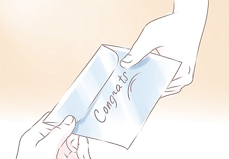 Share your excitement that someone is getting married. When you're congratulating someone who just got engaged or married, show some excitement for them! Give them a call or write a note on Facebook to tell them you wish them many years of happiness. If you're close, an additional gesture is probably in order: Send a card with a personal note congratulating the couple. Consider sending a small gift, like flowers or a bottle of wine. If the person is a colleague, have everyone in the office sign a card for the happy coworker. Consider throwing a shower if you're close to the person.