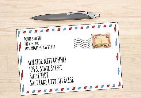 Send him a letter to share your opinions or advocate for a cause. Romney has 2 office locations—one in Salt Lake City and another in Washington, DC. If your concerns are centered around what's happening in Utah, address your letter to the Salt Lake City address. Otherwise, opinions or comments about politics in general can be sent to the D.C. location. His Salt Lake City address is:125 S. State StreetSuite 8402Salt Lake City, UT 84138 Romney’s Washington, DC address is:124 Russell Senate Office Building Washington, DC 20510 Write legibly and professionally, addressing the letter to Senator Romney and concluding it with "Sincerely" and your name.