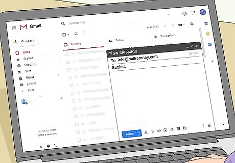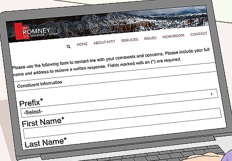 Use Romney’s submission form to contact him about political matters. Visit Mitt Romney’s website at https://www.romney.senate.gov/ and click on “Contact.” This takes you to a submission form where you fill in information such as your name, address, and the message you’d like to share with Mitt Romney. Once you’ve filled in all of the required boxes and typed your message, click “Send Message.” The submission form will also ask you for your email address and message topic. Type any comments or concerns you have to share with Mitt Romney in the message box, keeping your wording professional.