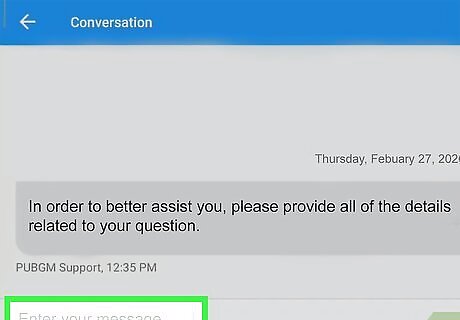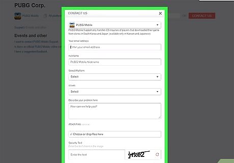 Submit a ticket through the help-desk site if you live in South Korea or Japan. Currently, you can only fill out the support form on the web if you live in South Korea or Japan. Click on the Contact Us button at the top right corner on the help-desk website. Fill in your email address, PUBG mobile nickname, and what operating system you’re using. Explain the issue you’re having in as much detail as possible so customer service understands the problem. Add screenshots from the game if you want before submitting the form. Customer service will usually send an email within a day to help resolve the problems you’re having.Warning: If you fill out a ticket and live in a different country, you will not get any response back from customer support.