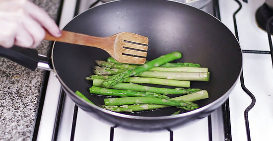 Add the asparagus to the pan. Carefully place the asparagus in the pan. Use a wooden spoon or spatula to stir-fry it until it's tender, about 3 to 6 minutes. The asparagus is ready when it's bright green with a few charred spots. If you're making a stir fry, add other vegetables to the pan at the same time. Carrots, onions, green peppers, and mushrooms are all delicious served in a stir fry with asparagus.