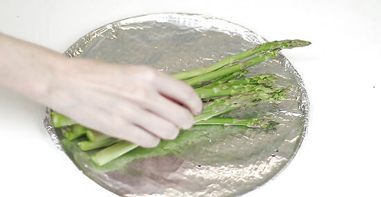 Place the asparagus spears on a baking sheet. Arrange them in a single layer so that they'll cook evenly.