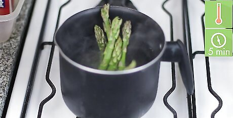 Boil asparagus. This is an easy way to cook asparagus, but you have to be careful not to overcook the spears. They can quickly become limp and mushy if you aren't careful. Place a few inches of water and 2 teaspoons salt in a saucepan. Bring the water to a full boil. Place the asparagus spears in the boiling water. Once the water returns to a boil, cook for 5 minutes. If you wish, use a microwave-safe cooking dish to boil asparagus in the microwave. Fill the cooking dish with ¼ cup water, then add the spears and place the lid on the dish. Cook the asparagus on your microwave oven's high power setting for 3 minutes, then open the door and stir. Finish cooking until the spears are just barely tender, about 3 to 4 more minutes.