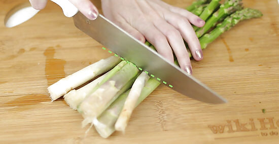Cut the asparagus or leave the spears whole. If you want to make a stir fry, slice the spears into 1 to 2-inch pieces for stir-fry, making the cuts diagonally.