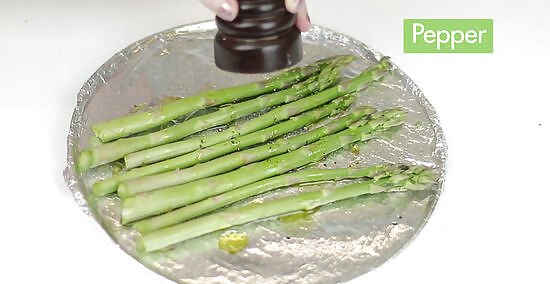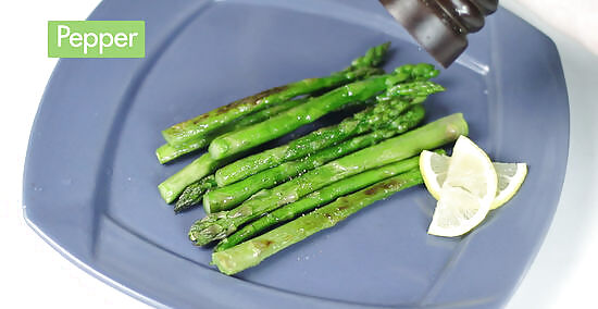Season with salt and pepper. Sprinkle salt and pepper to taste over the asparagus spears. To take the dish up a notch, grate some Parmesan cheese over the asparagus, too.