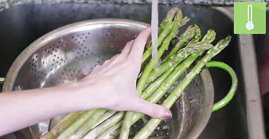 Wash fresh asparagus under cool running water. Asparagus is grown in sand, so it might have some sandy residue left in the cracks and crevices. Hold it under running water for a few moments. If sand is hiding in the tips, fill a large bowl with cool water, then dunk the asparagus in the water until the sand is removed.