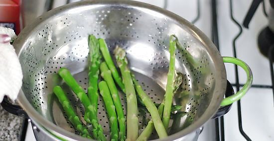 Blanch the asparagus. This is a common way to quickly cook asparagus to perfection and serve it cold in salads or as a luncheon side dish. If you'd prefer to serve the asparagus warm, skip the ice water bath. Here's how to blanch asparagus: Boil a large pot of water and 2 teaspoons of salt. Place the asparagus in the water and let it cook for 2½ - 5 minutes. Test an asparagus spear for doneness - it should still be crispy, not limp. If you wish, plunge the asparagus in a bowl of ice water to cool it down.