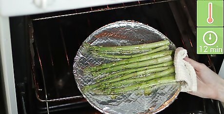 Roast for 12 minutes. Place the asparagus in the oven and roast it for 12 minutes, until it turns bright green and appears charred in a few places. Take care not to overcook it, as it will quickly burn if left in the oven for too long.