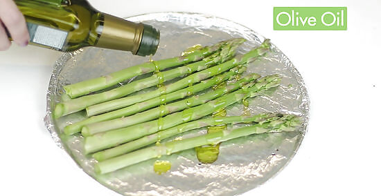 Drizzle olive oil over the spears. The oil will help the asparagus stay crisp. Drizzle 2 tablespoons (29.6 ml) of olive oil evenly over the spears on the baking sheet. If you'd like to ensure the spears get evenly coated, you can toss them with the olive oil in a bowl, then arrange them on the baking sheet.
