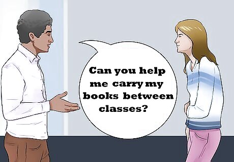 Ask your friends for help. Explain your condition to your friends, and ask them if they would be willing to help you with small tasks throughout the day. Let them know that these won’t be significant or take up much time. If they agree, inform your teacher that they are assisting you, and your teacher may forgive them if they come to class late with you. You might ask: “Can you help me carry my books between classes? When my hands get stiff, I tend to drop them.” “Do you mind if I borrow your notes? With my arthritis, I can’t write fast enough to keep up.” “Can we talk sometime? I’ve been feeling down lately, and I need to speak to someone I trust.”