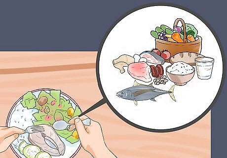 Change your diet. While there is mixed evidence about the relationship between food and arthritis, some foods may be able to reduce your inflammation. This means that you will feel less pain and stiffness overall. Avoid red meats, full-fat dairy, and fried or processed food. Some good foods include: Fish Oranges Bell peppers Food rich in, or fortified with, vitamin D and calcium, such as some dairy products Fruits and vegetables
