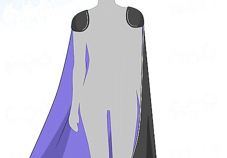 Get black and purple material and sew it together. Add jagged edges and hem. Wear the cape you just created with the black side facing out and the purple side facing in. Attach the cape onto your shoulders with black shoulder pads.