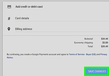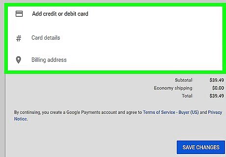 Click the credit/debit card logo and select a payment method. Select a credit card or payment method associated with your Google account. If you don't have a payment method saved in Android pay, you can click Add credit or debit card to add a new card.