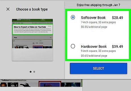 Select "Hardcover" or "Softcover" and click SELECT. Softcover is the smaller and cheaper option. Hardcover is larger and costs a little more.