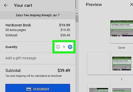 Click the "+" or "-" icon adjust the quantity. Click the "+" or "-" button if you want to change how many copies of the photo book you want to order. You can also a message if you want to ship the photo book to someone else directly.