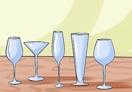 Select a variety of glasses. Different alcohols are traditionally served in different glassware. Beer is often served in a mug or pilsner glass. Whiskey is served in a short rocks glass. Cocktails are often served in tall glasses. Include an efficient selection of glassware in your home bar. You don’t need a dozen of every glass, but stock at least a few of each. It also depends on how often you entertain guests and how many there are likely to be. For personal use, one glass each of five or six types is plenty. Store extras for guests somewhere else and only get them out when you need to.