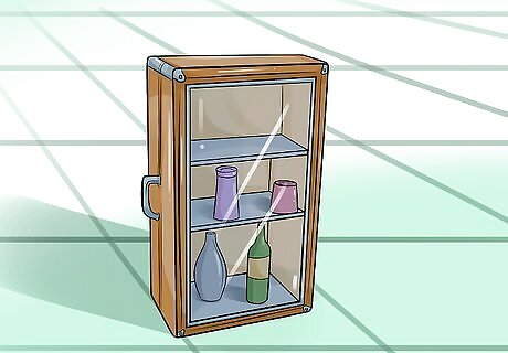 Hang a shelf or rack for wall storage. You may not have room for a large set of cabinets. Instead, hang a couple of shelves on the wall for drink and glass storage. Add a rack that hangs glassware upside down to existing cabinetry for more storage. Hang shelving at about chest level so it is easy to access. Shelves don’t need to be large. A two foot long shelf that’s six inches deep will hold more than you might think. Look at antique stores or home improvement stores for wall-mount storage options. Using an old medicine cabinet will give you a good amount of storage and won’t take up much room on the wall. You also have the option to keep it closed when the bar is not in use.