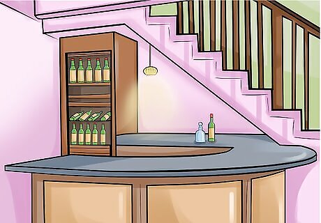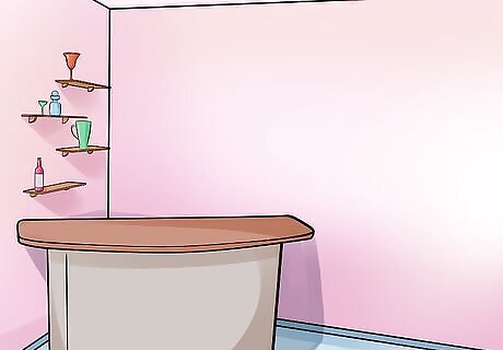 Choose a room to set up your bar in. Look around your house and pick the room where you are most likely to entertain guests or spend a lot of time hanging out. If you have a furnished basement, it’s a great spot for a bar. If you entertain in your living room, set your bar up there. It’s also easy to set your bar up in or near the kitchen so you have access to water. You can transform any blank wall into a bar with open shelves and built-in cabinets. Bar carts will be explained more later, but these allow you to set the bar up anywhere. Bar carts are versatile because you can change which room the bar is in each day, if you want to.