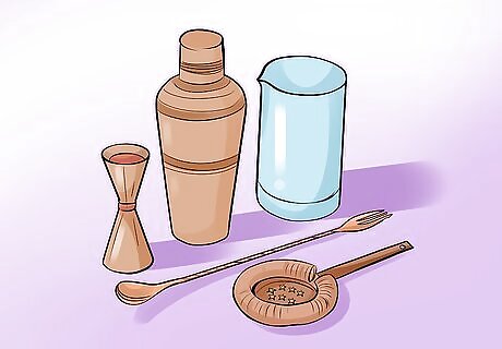 Set out some basic bar tools. Get a bar spoon, which is extra long, or a swizzle stick for mixing cocktails. Have a couple of shot glasses or small measuring cups for measuring out ingredients. Have a paring knife for cutting fruit. Have a shaker and strainer for mixing shaken cocktails.
