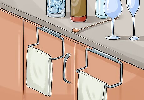 Keep a couple of towels at the bar at all times. Think about how often you spill something in the kitchen, then translate that to a place where the sole activity is pouring liquids. Keeping towels at your bar will help keep messes contained. Without a towel, you’ll waste time running to find one frequently. If your bar setup allows for a towel rack, this is always helpful. If not, set towels on the shelf where your assorted bar tools are kept.