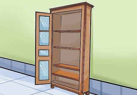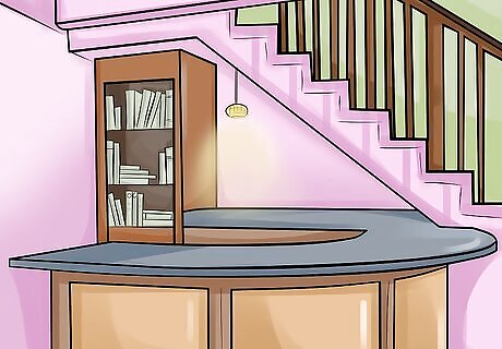 Clear some bookshelf space for a small bar. Use an existing bookshelf, or set up a new one. This is helpful because it uses available vertical space, and it doesn’t have much width or depth. Clear two or three shelves on a bookshelf in the bar area. Use one shelf for drinks, one shelf for glassware, and one shelf for extras like shakers or an ice bucket. For an existing bookshelf, leave the rest of it full of books or anything else to add a bit of atmosphere to the bar area. If you set up a new bookshelf, make the whole thing into an extensive bar or use some of the space for decorations.