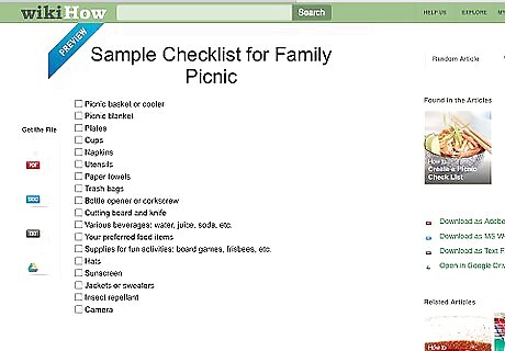 Plan ahead. Much like the romantic picnic, the family picnic is made much more festive when a little forethought is used. Nothing spoils the fun more than not having a corkscrew or a fork when you need one! Keep a "picnic" box. Load it with plates and napkins, plastic utensils, a spare bottle opener and corkscrew, plastic food containers, wraps, bags, and other non-perishables. Keep a copy of your favorite picnic recipes in the box, too.