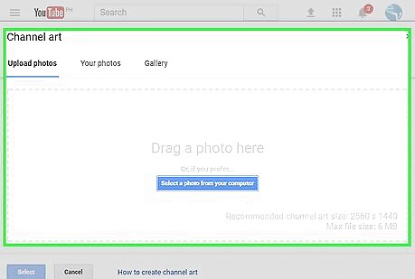Add channel art. This is an image that is seen at the top of your channel page. YouTube will show examples of how the image will be displayed on the website, a TV, or a mobile device. Try to put the focus of the picture in the middle; when your channel is viewed on a mobile device, the sides of the picture will be cut off. You don't want to be left with half your face! Choose art that grabs viewers' attention. It should be 2560 x 1440 pixels, and it must be relevant to your channel's message. Include your channel's name or a message in the channel art. This will help solidify your name in the viewer's mind. Change your channel art regularly. Unless you want to set a brand image by keeping the same picture, consider regularly changing your channel art about what content you are releasing in your channel. For example, if you are doing comedy sketches, change the channel art so that it relates to your current set of sketches. You don't need Photoshop. GIMP, Picmonkey, Pixlr, and Krita are examples of programs you can use to draw for free. Don't steal art. Never take someone else's work without permission. Use free stock photos or draw your own.